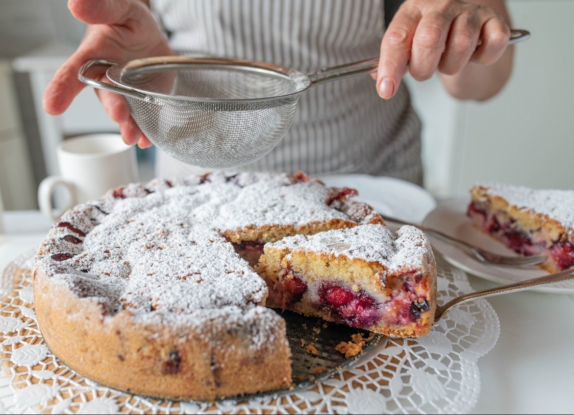 Pečeno pecivo približno 10 minut hladimo v modelu, nato pa previdno odstranimo obod in pustimo, da se pecivo povsem ohladi. Ohlajeno potrosimo s sladkorjem v prahu, narežemo na kose in postrežemo.