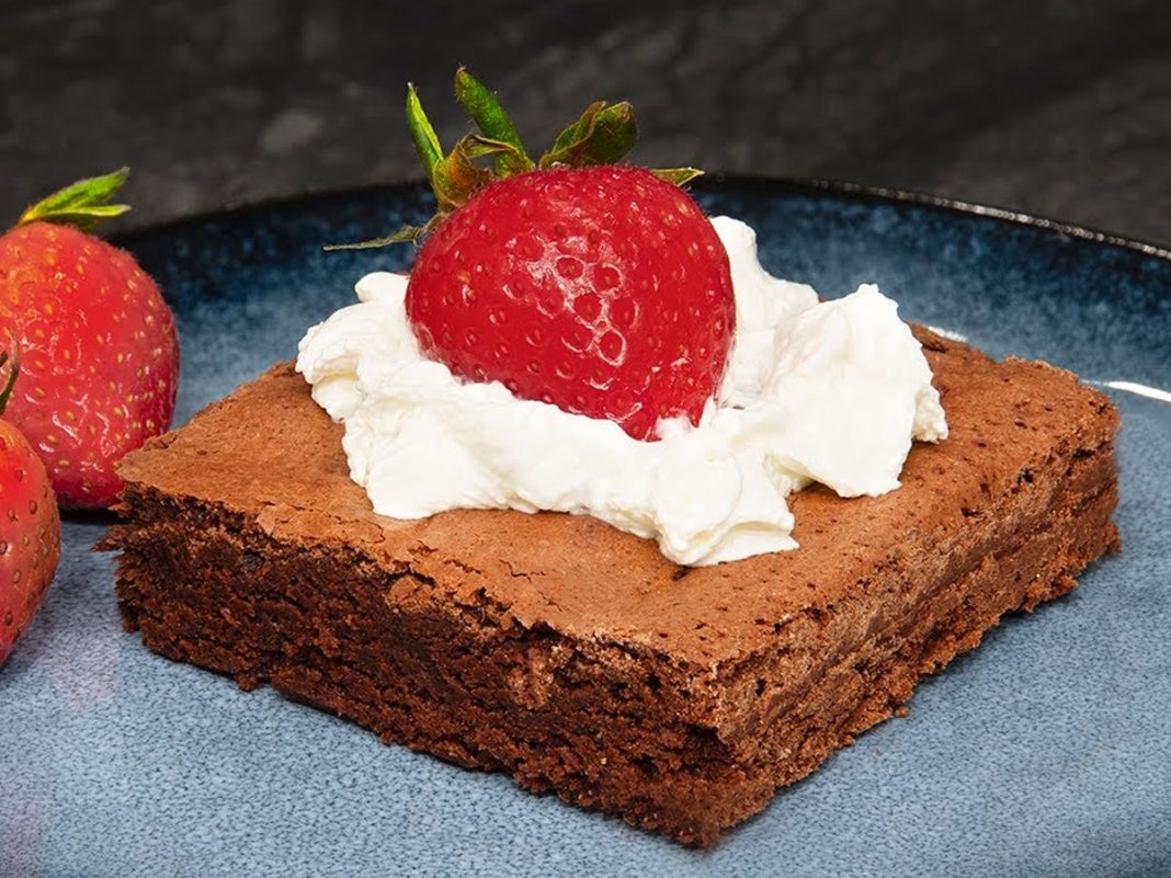 3 jajca 250 g sladkorja 1 vanilijev sladkor Ščepec soli 200 g stopljene temne čokolade 120 g stopljenega masla 80 g navadne moke 25 g kakava Smetana in jagode za dekoracijo