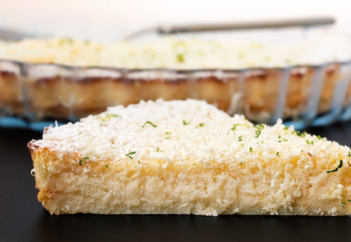 Ena tistih čudovitih sladic, s katerimi res nimamo veliko dela, končni rezultat pa nas kljub temu navduši. Za pripravo potrebujemo samo eno skledo, v kateri zmešamo vse sestavine, zmes pa nato prelijemo v namaščen pekač in pustimo, da pečica opravi svoje delo. Med peko se bo masa ločila na posamezne plasti, biskvitu podobno zgornjo in pudingu oziroma kremi podobno spodnjo plast s čudovitim okusom po kokosu in limoni.