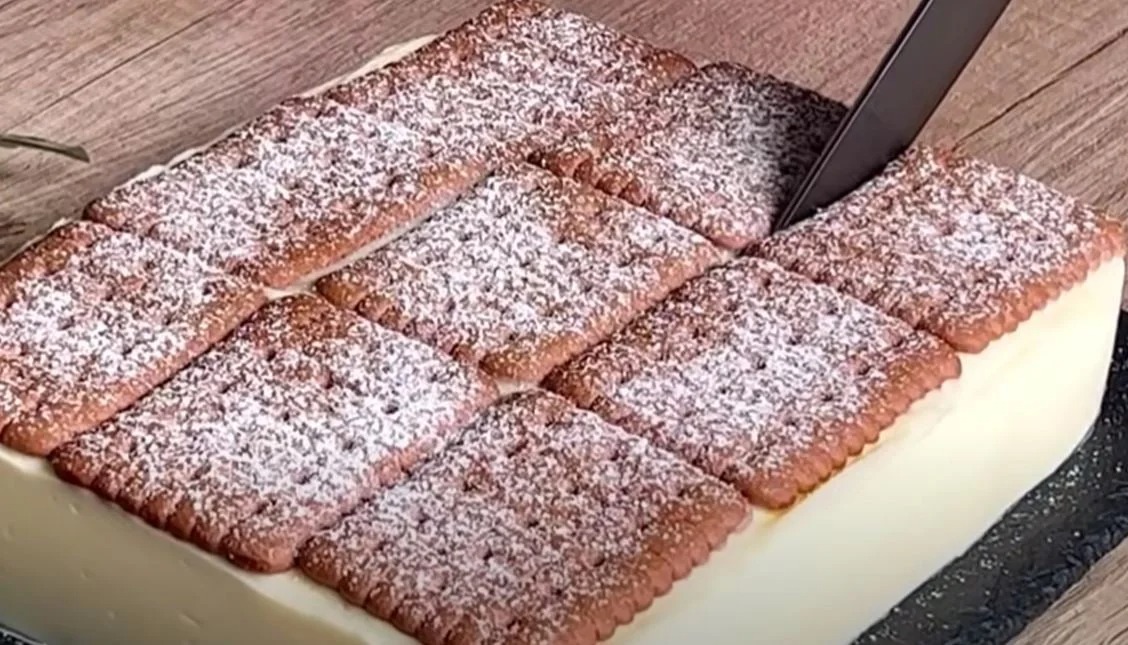 2 jajci 220 g sladkorja vanilijev sladkor 50 g koruznega škroba grški jogurt ali kislo smetano 70 g masla 18 kosov albert keksov, plazma keksov ali drugih