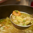 Piščanec se kuha v slastni piščančji osnovi, dodatek ingverja in česna pa jedi doda svežino in globino okusa.