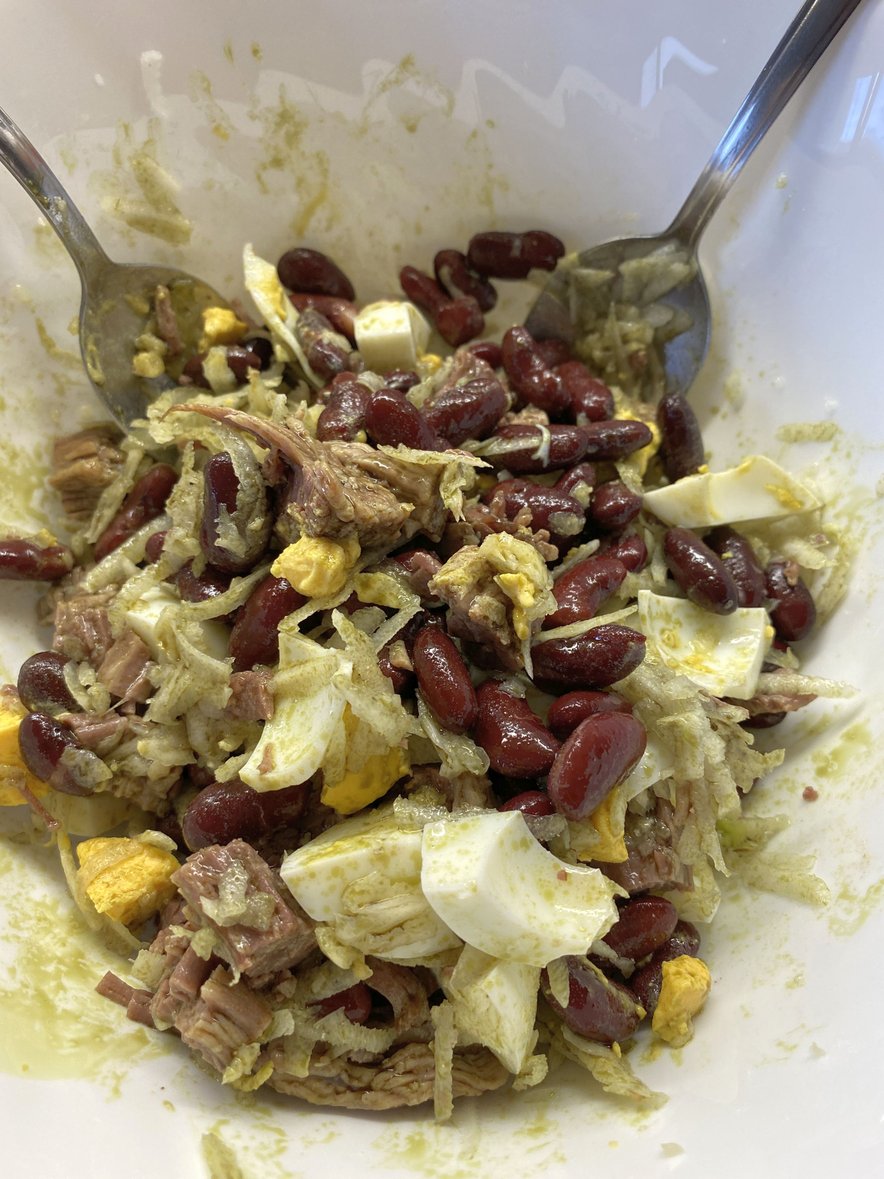 Marsikomu zelo ljub način porabe mesa iz juhe je, da pripravimo okisano solato s čebulo in bučnim oljem, tokrat pa v solati poleg mesa kraljujejo še fižol, kuhano jajce in črna redkev. Zaradi vseh dodanih sestavin je solata zelo nasitna, vendar se zraven vseeno prileže sveže pečen domač kruh. Po možnosti še malo topel. Posebna goveja pašteta