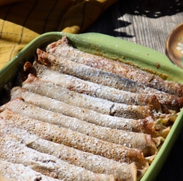 5. Vsako palačinko posebej namažemo, zvijemo in položimo v pekač.