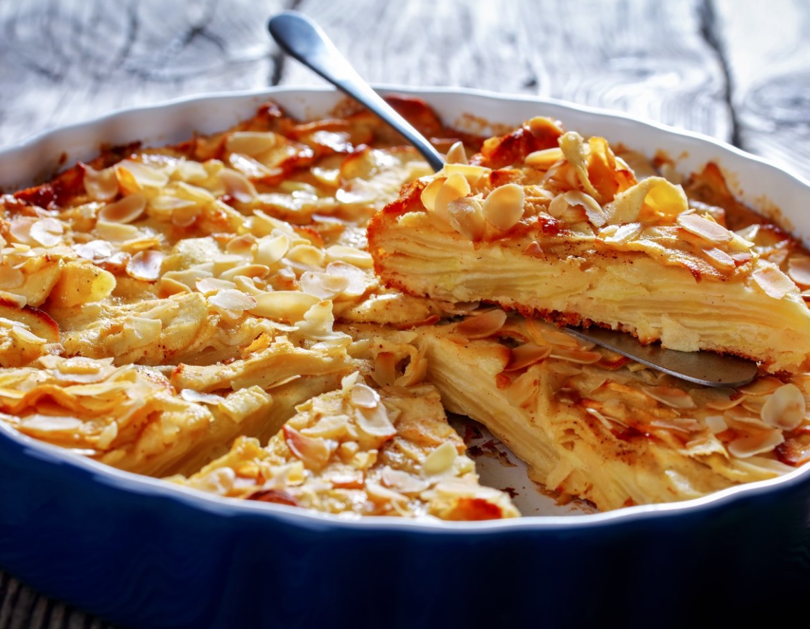 Pečico segrejemo na 190°C. Pekač premera 22 cm namažemo z maslom in poprašimo z moko. Vanj vlijemo zmes z jabolki in poravnamo s kuhalnico. Pečemo 30 minut, potresemo še z mandljevimi lističi in vrnemo v pečico še za 10 minut.