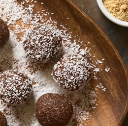 2 Z roko oblikujemo srednje velike kroglice in jih polagamo v kokosovo moko. Povaljamo, da se kokosova moka prime iz vseh strani in kroglice zlagamo v skledo.