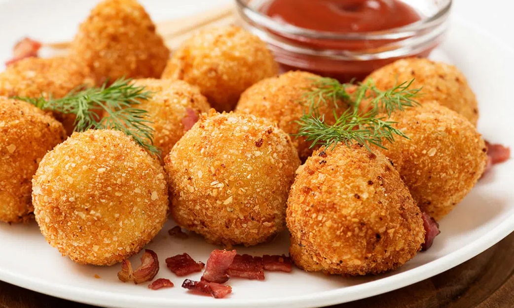 V roki si oblikujemo kroglice in vmes damo oljko. Kroglice povaljamo v drobtinah. Pražimo v ponvi s segretim oljem.