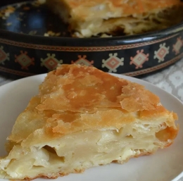 Na peto plast položimo polovico nadeva, ki ga prikrijemo z drugimi petimi listi. Nanje položimo preostalo polovico nadeva, ki ga ponovno prikrijemo s petimi plastmi listnatega testa.