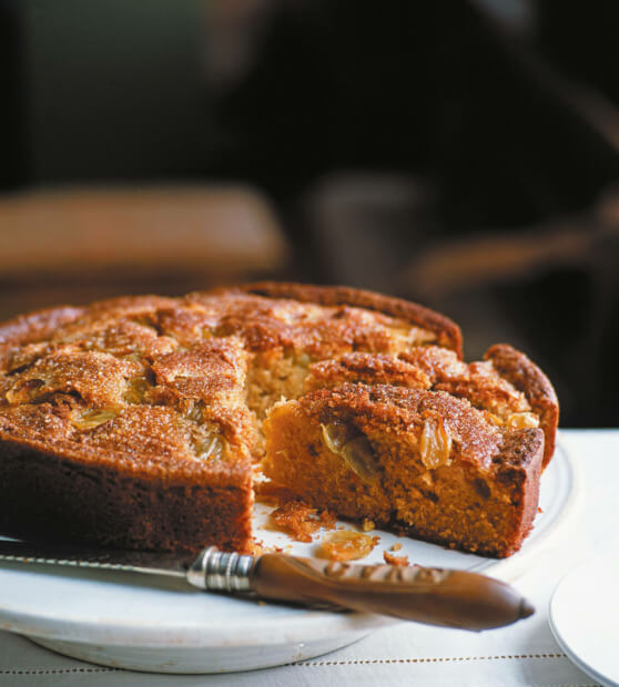 Pečico segrejemo na 180 °C. Model za torte premera 23 cm namažemo z oljčnim oljem, vanj vsujemo žlico moke in jo stresemo po modlu, tako da enakomerno prekrije dno in obod, odvečno moko stresemo ven. V skledi stepemo sladkor muskovado in maslo, da nastane kremasta masa. Drugo za drugim vmešamo jajca, nato narahlo vmešamo še pomarančno in limonovo lupinico. Skupaj zmešamo ohlajeno vino in oljčno olje, nato malo mešanice prilijemo masi za kolač. Pomešamo, nato narahlo vmešamo tretjino moke in pecilni prašek. Izmenično dodajamo tekočino in moko, dokler ni vse zmešano in nastane gladko testo.