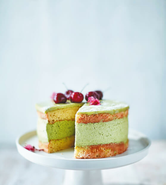 Globljega od modlov obložimo z dvojno plastjo prozorne kuhinjske folije in pazimo, da je obod dobro prekrit. V model položimo en biskvit z bolj ravno stranjo navzdol. V skledo nalijemo preostalih 4,5 dl smetane, dodamo sladkor v prahu in stepemo toliko, da ima smetana mehke vršičke, nato narahlo vmešamo ohlajeno smetano z mačo. Kremo postrgamo v model in poravnamo površino. Na vrh položimo drugi biskvit z bolj ravno stranjo navzgor in ga nežno pritisnemo v kremo. Model zavijemo v prozorno folijo in postavimo v hladilnik za najmanj 4 ure.