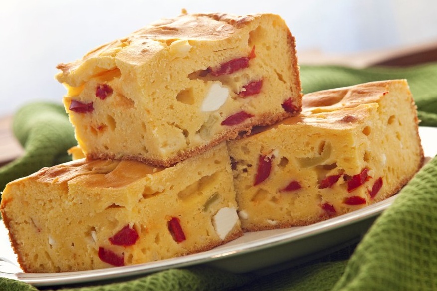 - 4 jajca - 300 g svežega sira - 180 g jogurta (ali kislo mleko) - 150 ml olja - 150 g gladke moke - 100 g koruzne moke - 1 pecilni prašek - 150 g šunke - 2 reči papriki - kisle kumarice (po želji) - sol