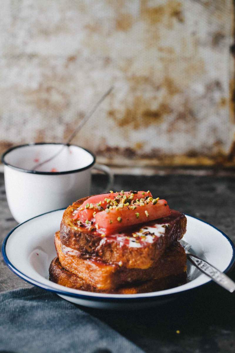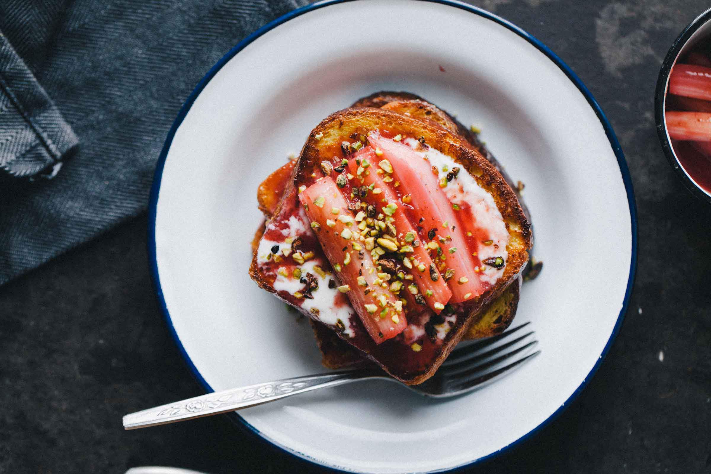Šnite postrežemo s kuhano rabarabo ter s sirupom, ki je ostal od kuhanja. Dodamo tudi malo sladke smetane in sesekljanih pistacij.