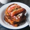 100 g sladke smetane 50 g mleka 1 jajce 1 žlica sladkorja 4 debele rezine mlečnega belega kruha (brioche) 30 g masla 50 g sladke smetane (za preliv) 20 g pistacij, sesekljanih (za posip)