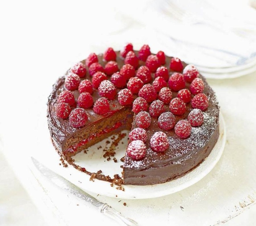 Za glazuro zavremo smetano in vanjo vmešamo nasekljano čokolado. Mešamo, da se čokolada raztopi. Počakamo nekaj minut, da se glazura nekoliko zgosti, nato jo prelijemo po biskvitu. Okrasimo s preostalimi malinami in torto pustimo ohlajati 24 ur v hladilniku. Približno eno uro pred postrežbo vzamemo torto iz hladilnika, posujemo jo s sladkorjem v prahu in ponudimo z žlico vaniljeve kreme.