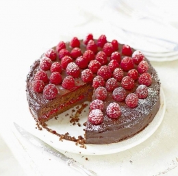220 g temne čokolade (70 %) 170 g masla 2 žlički vaniljeve arome ¼ žličke instantne kave ali kavine arome 100 g praženih mandljev 2 zvrhani žlici moke ½ žličke soli 5 jajc 140 g rjavega sladkorja 12 svežih ali zamrznjenih malin 40 malin za okras 4 žlice malinovega džema sladkor v prahu za posip vaniljeva krema, ko postrežemo