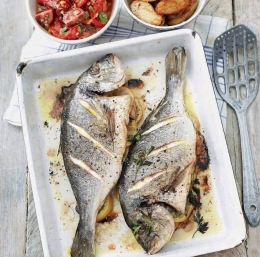 2 večji očiščeni oradi 2 limoni oljčno olje za pokapanje ribe sol pečen mlad krompir za prilogo salsa romesco 3 rdeče paprike 600 g paradižnika 1 strok česna 1 rdeč čili majhen šopek peteršilja 50 g praženih lešnikov 1 žlica šerijevega kisa 3 žlice ekstra deviškega oljčnega olja