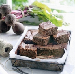 500 g surove rdeče pese (3–4 srednje veliki gomolji) 100 g masla 200 g kakovostne temne čokolade (70 % kakava) 1 žlička vaniljeve arome 250 g rjavega sladkorja 3 jajca 100 g moke 25 g kakava v prahu maščoba za pekač