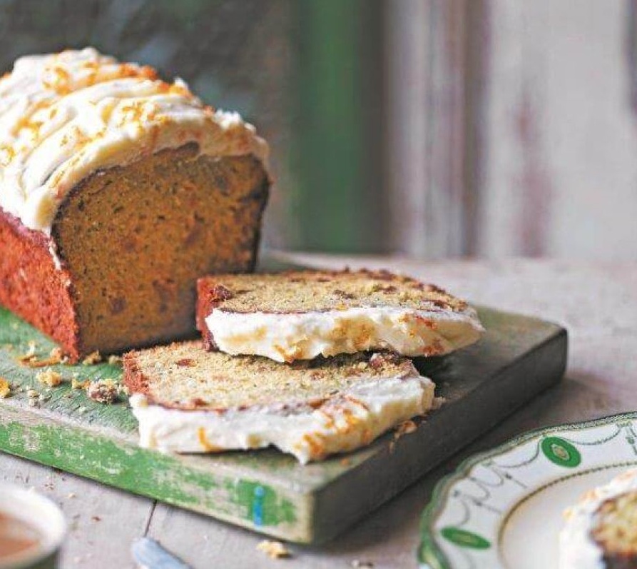 Medtem ko se kolač ohlaja, pripravimo kremo, tako da kremni sir zmešamo s presejanim sladkorjem v prahu – ne mešamo preveč, sicer bo krema premehka – in jo postavimo v hladilnik, da bo hladna. Z njo premažemo ohlajen kolač, posujemo še z malo pomarančne lupinice in do postrežbe shranimo v hladilnik (kjer se ohrani do 1 teden).