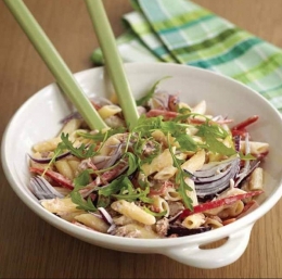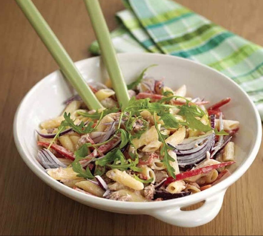 300 g peresnikov 4 žlice majoneze sok ½ limone 200 g tunine v oljčnem olju 2 rdeči papriki 1 rdeča čebula velika pest rukole sol