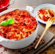Čebulo olupimo, razpolovimo in narežemo na tanke rezine. Papriko operemo, razpolovimo, odstranimo semenje in narežemo na tanke trakove.