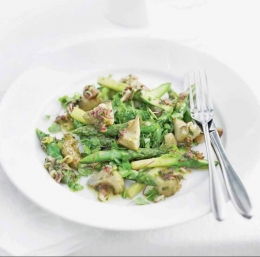 4 obrezane artičoke (artičokini srčki, glej postopek priprave artičok) 2 razpolovljeni limoni 3 žlice oljčnega olja 1 žlica koriandrovih semen 1 zvezdasti janež 1 vejica timijana 4 žlice vinskega kisa velik šop (kakšnih 30) špargljev 4 pesti drobnolistnate solate (glej nasvete)