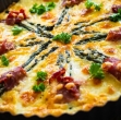 V skodelici razžvrkljamo jajce, dodamo rikoto, gorčico in kislo smetano ter primešamo pršut, šparglje in sir.