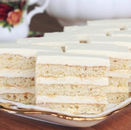 Ohlajeno pečeno testo premažite s kremo in pokrijte z drugo plastjo testa, znova premažite in nadaljuje dokler vam ne zmanjka testa. Na vrhu premažite s preostankom kreme.