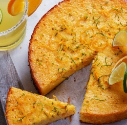 Pečeno torto nekaj minut hladimo v pekaču, potem pa jo preložimo na rešetko in pustimo, da se povsem ohladi. Ohlajeno serviramo na lep krožnik ali pladenj, okrasimo z rezinami in lupinico citrusov, razrežemo na poljubno velike kose in postrežemo s stepeno smetano, sladoledom ali grškim jogurtom.