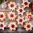 Pečico segrejemo na 180 stopinj Celzija. Nizek pekač za piškote obložimo s papirjem za peko. Testo vzamemo iz hladilnika in ga na rahlo pomokani delovni površini razvaljamo približno 3 mm debelo. S pomočjo modelčka izrežemo zvezde. Polovici piškotov z manjšim modelčkom v sredini izrežemo zvezdice (lahko uporabimo modelčke različnih oblik - srček, rožica ipd.).