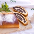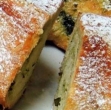 Vzhajano testo pregnetite in pustite nekaj minut počivati. Razvaljajte ga v pravokotnik, premažite z nadevom in enakomerno potresite rozine. Zvijte v tesen zvitek, prestavite v pomaščen pekač, premažite z jajcem ter z iglo prebodite na več mestih.