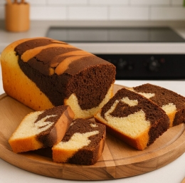 Testo razdelite na dva enaka dela. V en del dodajte kakav in mleko ter premešajte. Če je masa pregosta, dodajte še malo mleka. Naredite marmorni vzorec: V kalup izmenično vlivajte svetlo in temno zmes. Z nožem nežno potegnite nekaj linij skozi testo, da ustvarite marmornat učinek.