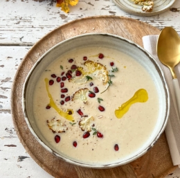 Pečena cvetača nima tistega močnega okusa po "kapusnicah" in zato je juha iz pečene cvetače veliko okusnejša. Moje dete, ki ne mara cvetače, jo je pojedlo cel krožnik. Juho lahko popestrite še z granatnim jabolkom in praženim sezamom. Noro, kako se okusi lepo prepletejo in povežejo.
