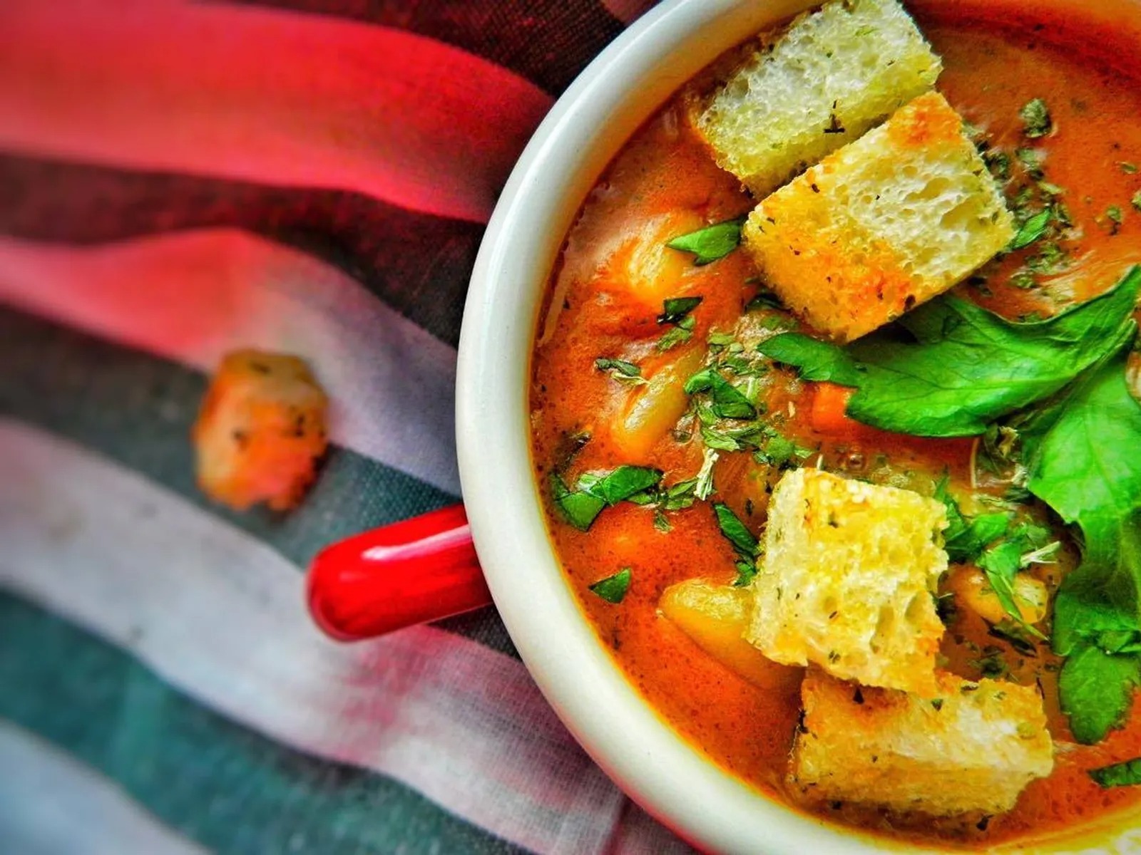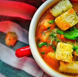 Za prilogo k tej enolončnici sem spekla kruhove kocke z olivnim oljem in peteršiljem.