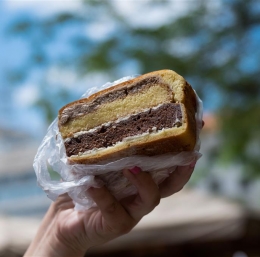 Premažemo z drugo tretjino nadeva in nanj položimo temen biskvit. Ponovno premažemo z nadevom in pokrijemo z robovi vzhajanega testa, ki so štrleli iz pekača.