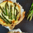 340 g narezanih divjih špargljev 240 g čedarja ali podobnega sira 240 ml sladke smetane 3 velika jajca sol in poper po okusu čajna žlička masla