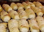 Testo razvaljajte na debelost 2-3 mm in razrežite na trakove 3 cm. Ovijte jih vzdolž tulcev za peko, tako da prekrijejo celoten tulec. Položite jih na pekač ter premažite z stolčenim rumenjakom. Pečite jih na 220 stopinj, dokler rahlo ne porumenijio.