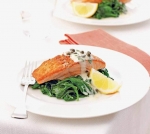 PostopekV ponvi segrejemo olje. Lososove fileje na obeh straneh začinimo s soljo in jih pečemo 4 minute na vsaki strani. Pečene damo na krožnik in jih pustimo počivati, medtem ko kuhamo špinačo.