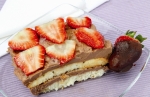Jagode umijemo, na papirnatih brisačah dobro odcedimo, nare??emo na lističe in naložimo na strjeno kremo. 1 žličko želatine zmešamo s 3 žlicami hladne vode in pustimo, da nabrekne. V lončku zavremo 0,8 dl vode in 1 žlico sladkorja, dodamo želatino, odstavimo ter mešamo, da se želatina stopi.