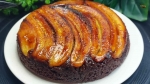 Če je testo pečeno, enostavno preverimo z zobotrebcem. Če zobotrebec ostane suh, ko ga zapičimo v testo, je okusna sladica pripravljena. Preostane nam le še, da jo položimo na krožnik, in sicer tako, da je del z bananami na vrhu.