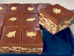 Kuhano čokoladno zmes prelijte čez piškote in premešajte. Vlijte v pekač, velikosti 20 x 24 cm in zgladite z lopatko. Postavite v hladilnik za 10 minut.