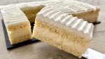 Ko je biskvit pečen, ga odstranimo iz peki papirja in prerežemo na pol, da dobimo dve enaki polovici.