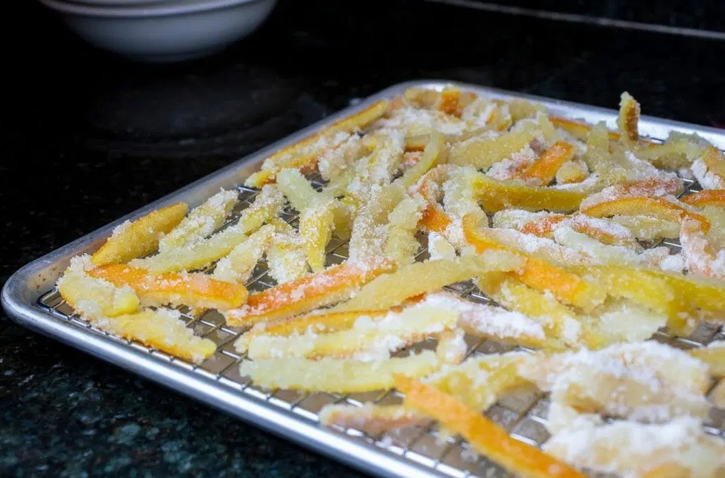 Naslednji dan sirup ponovno zavremo in olupke zopet pokuhamo. Tokrat samo 2 minuti in pol in jih ponovno en dan sušimo na peki papirju.