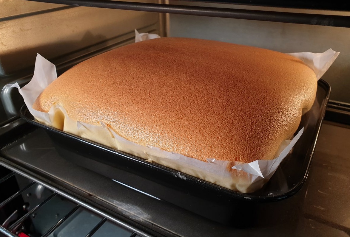 Pekač z maso postavimo v večji pekač, v katerega približno dva centimetra visoko vlijemo vodo, ogreto na 80 stopinj Celzija. Vse skupaj previdno prestavimo v ogreto pečico. Pustimo, da se kolač peče od 65 do 75 minut. Med peko bo narasel in se tudi dvignil nad stranice pekača, po vrhu pa se bo nežno zlato rjavo obarval. Pečice med peko ne odpiramo!