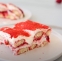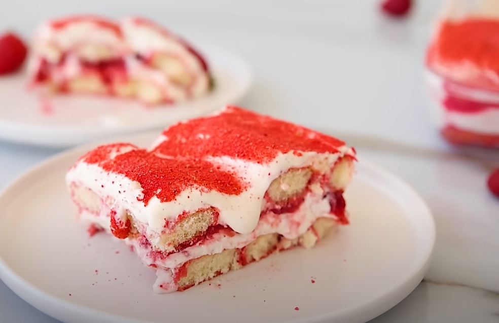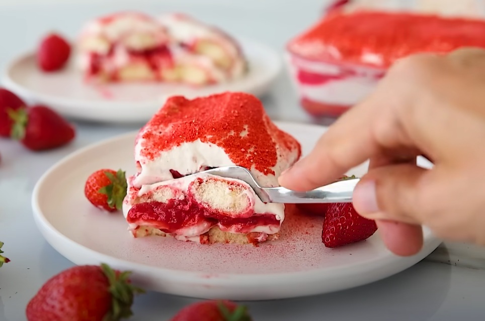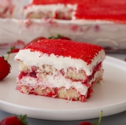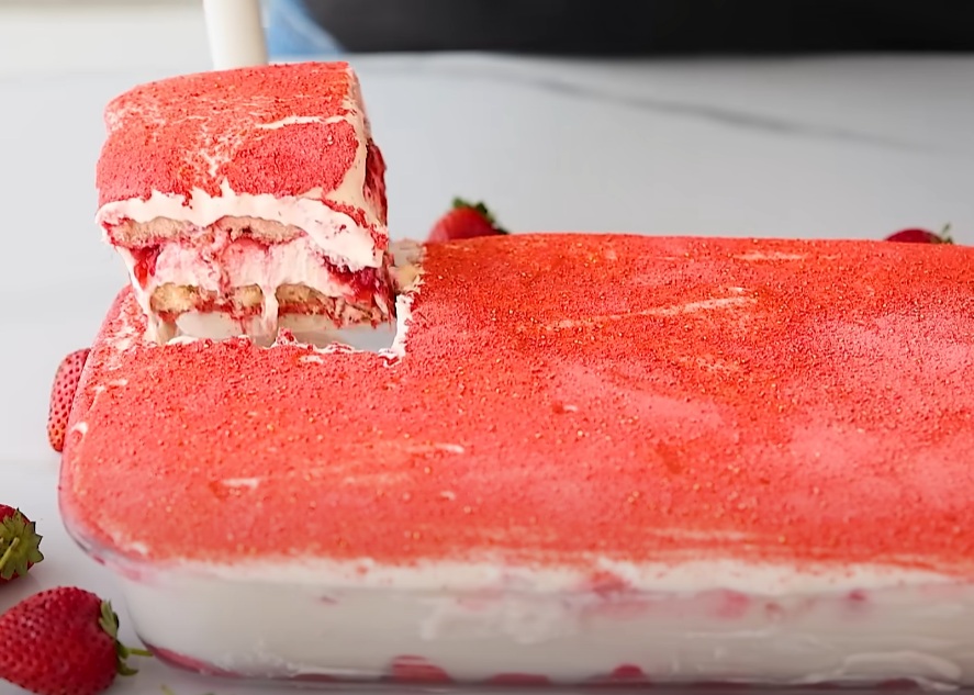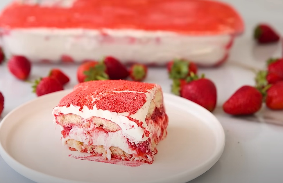 V modelu velikosti 23×33 cm hitro pomakamo piškote v jagodno-mlečno mešanico (1–2 sekundi) in jih razporedimo po dnu. Nanesemo polovico mascarpone kreme in jo lepo poravnamo. Čez kremo namažemo gosto jagodno omako.