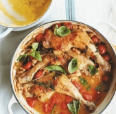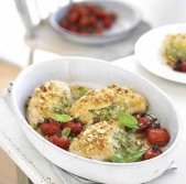 Piščančje prsi s kremnim pestom in pečenim paradižnikom