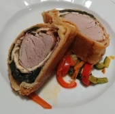 Ombolo v testu s pršutom, sirom in gobovo omako