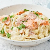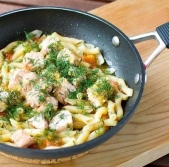 Široki rezanci s čemažem in dimljenim lososom