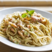Špageti z dimljenim lososom in pestom iz pistacij