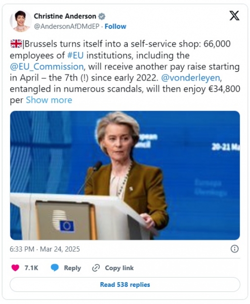 Ko pa gre za lastne plače, voditelji EU te pomisleke priročno ignorirajo. Zvišanje plač temelji na indeksu, ki sledi življenjskim stroškom za delavce EU v Belgiji in Luksemburgu, izračunanem na podlagi podatkov o inflaciji, značilnih za ti dve državi. Čeprav se je inflacija v EU leta 2022 povečala na 11,5 %, predvsem zaradi finančnega vpliva porabe, povezane s COVID-19, je od takrat padla. Do februarja 2025 je inflacija padla na samo 2,7 % v EU in 2,3 % v evroobmočju, ki vključuje države, ki uporabljajo evro. Omeniti velja, da nekateri uradniki EU prejemajo tudi mučno visoke odpravnine. Na primer, ko je Charles Michel lani odstopil s položaja predsednika Evropskega sveta – prav tako dela izvršilnega organa EU, kjer se sestajajo voditelji držav 27 držav članic EU, da določijo politično agendo – je prejel »prehodno nadomestilo« v višini okoli 260.000 evrov. Takšni privilegiji samo podžigajo ogenj javne jeze, medtem ko evropske elite še naprej polnijo svoje žepe, povprečni državljani pa se težko preživljajo. Grenka ironija je, da medtem ko EU nasprotuje zvišanju plač v svojih državah članicah, njeno osebje še naprej v svoj žep pospravlja vedno višje plače. Medtem ko običajni Evropejci zategujejo pasove, se zdi, da elite EU popolnoma nimajo stika z realnostjo, s katero se sooča večina ljudi.