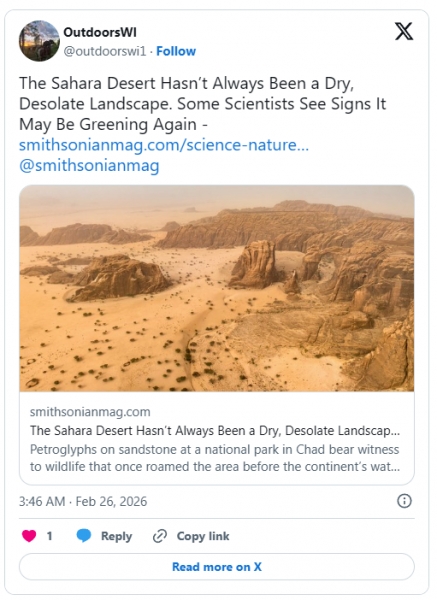 To odkritje je močan udarec za narativ o neustavljivi dezertifikaciji. Spominja nas, da je narava veliko bolj robustna in prilagodljiva, kot bi nas radi prepričali podnebni alarmisti. Poleg tega bi nas moral ta razvoj dogodkov spomniti, da je bila Sahara le pred nekaj tisoč leti (v zadnjem medledeniškem obdobju) bolj vlažna in zelena.