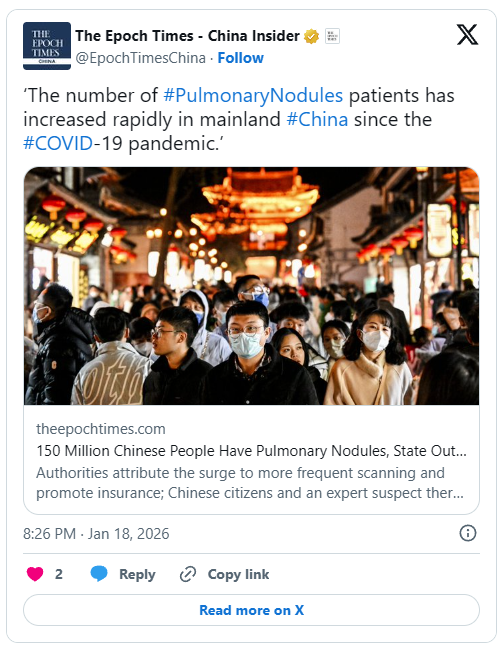 Uradni izgovor oblasti in glavnega zdravnika režima, Zhong Nanshan, zveni kot slaba šala: vozliči naj bi bili tako pogosto najdeni, ker se po pandemiji izvaja več CT preiskav. Poleg tega se krivi "onesnaževanje okolja". Prozorna taktika za preusmeritev pozornosti od resničnih vzrokov zdravstvene krize.